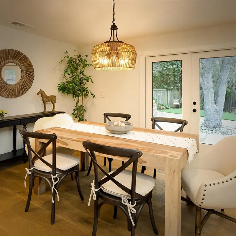 Voeg een vleugje rustieke charme toe aan je interieur met de 3-lichts Boho Boerderij Kroonluchter, een elegante hanglamp met een natuurlijk gevlochten rattan-ontwerp. Het open, luchtige karakter van de lampenkap zorgt voor een warme gloed die perfect tot zijn recht komt boven een eettafel, keukeneiland of in de hal. De combinatie van metalen details en boho-invloeden maakt deze hanglamp een stijlvolle blikvanger in elk modern landelijk interieur.Dankzij de universele E26-fitting is de lamp geschikt voor diverse lichtbronnen en eenvoudig aan te sluiten via vaste bedrading.