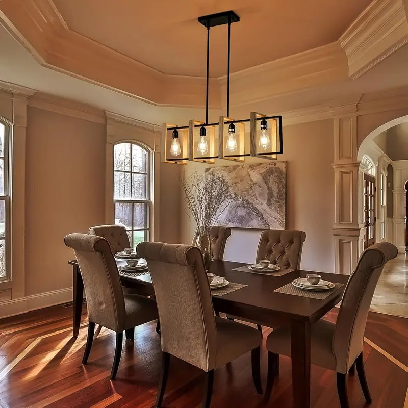 Breng een stijlvolle combinatie van moderne elegantie en industriële flair in je interieur met de 4-Lichts Moderne  Hangkroonluchter met Mat Zwarte Metalen Afwerking. Het langwerpige ontwerp, uitgevoerd in mat zwart met antieke metalen accenten, maakt deze lamp perfect voor boven een keukeneiland, eetkamertafel of biljarttafel. De open structuur biedt ruimte voor vier E26-lampen (niet inbegrepen), wat zorgt voor sfeervolle verlichting en een uitnodigende uitstraling. Dankzij de semi flush mount-bevestiging is deze armatuur geschikt voor verschillende plafondhoogtes en eenvoudig te installeren.