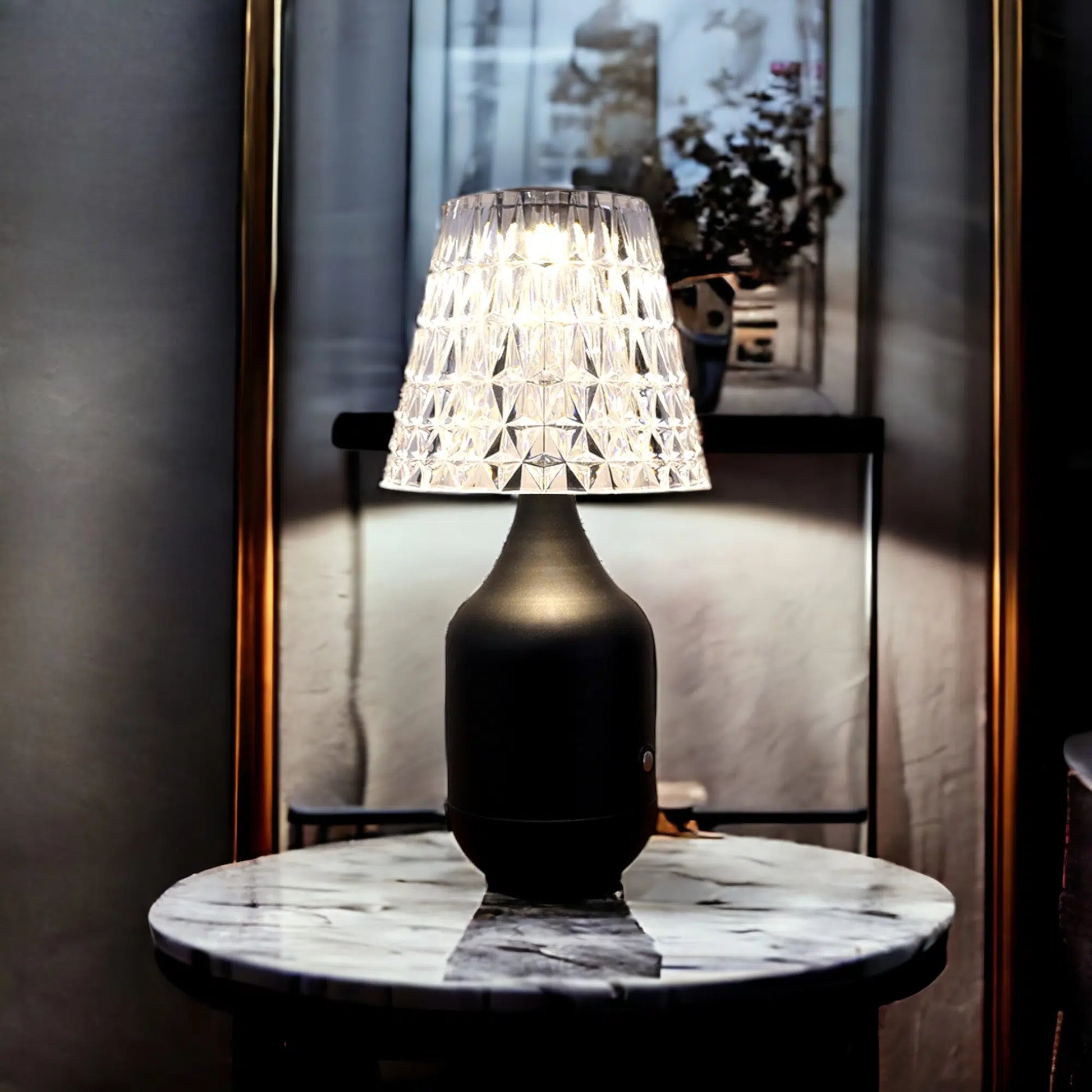 Breng sfeer en stijl in huis met de kristallen tafellamp, een combinatie van luxe en moderne technologie. De elegante kristallen kap en het metalen frame zorgen voor een warme, uitnodigende gloed in elke ruimte. Dankzij de draadloze werking, oplaadbare batterij en touchbediening is deze lamp zowel praktisch als verfijnd.