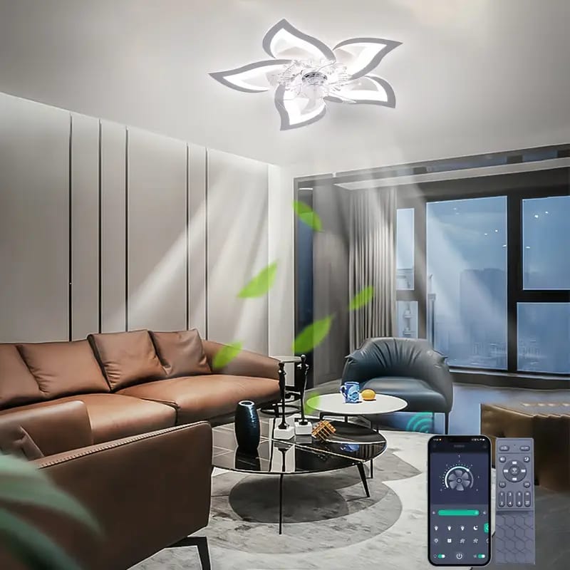 Ontdek de Moderne LED Lotusbloem Plafondlamp met Ventilator en Afstandsbediening, een stijlvolle plafondlamp met vijf heldere LED-lichtpunten en een fluisterstille ventilator. Creëer een warme sfeer en geniet van frisse lucht, allemaal eenvoudig te bedienen met de meegeleverde afstandsbediening. Het strakke acryl design en de semi-flush montage maken deze lamp perfect voor elk modern interieur. Comfort en elegantie in één slimme oplossing.