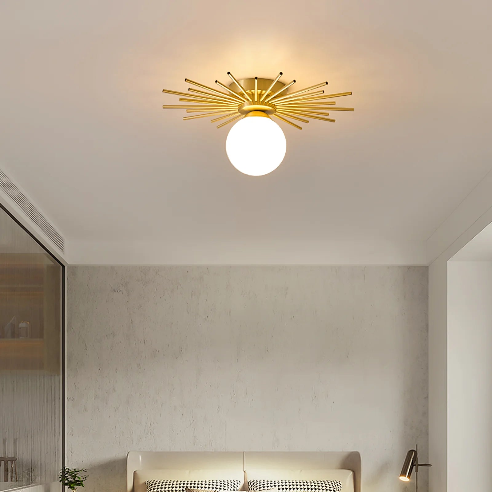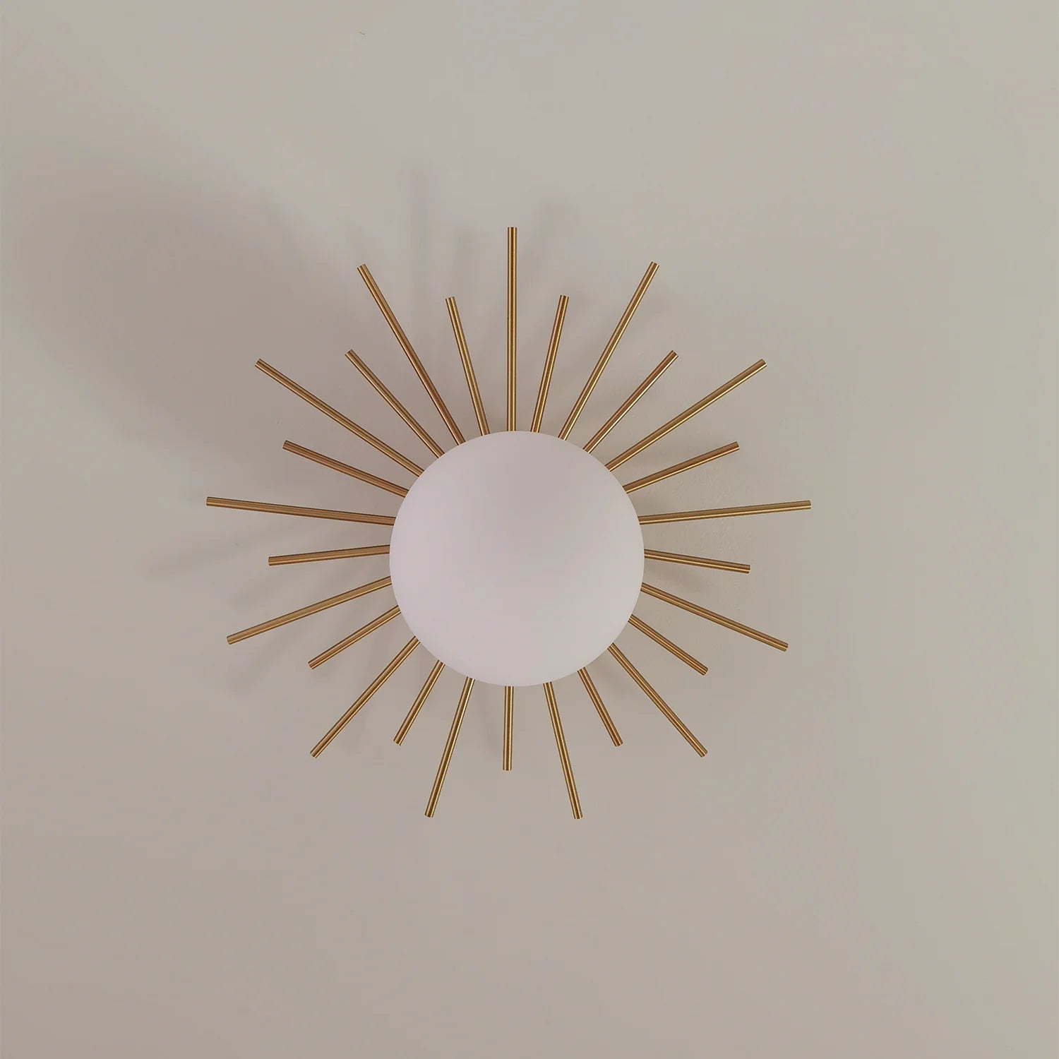 Voeg een glamoureus accent toe aan je interieur met de Sterlicht Plafondlamp. Het zonburst-design met messing staven en matte glazen bol zorgt voor een elegante, sfeervolle gloed – perfect voor slaapkamers, gangen of stijlvolle woonruimtes.