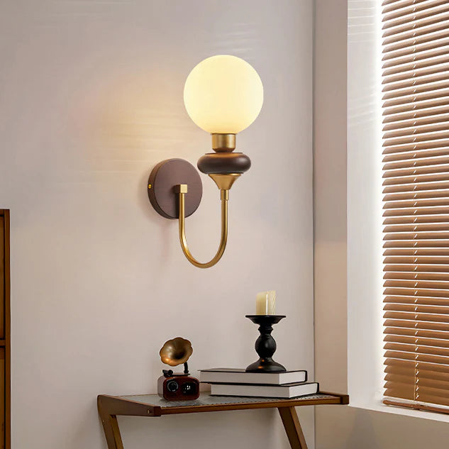 Vintage Glazen Bol Gebogen Houten Arm Wandlamp